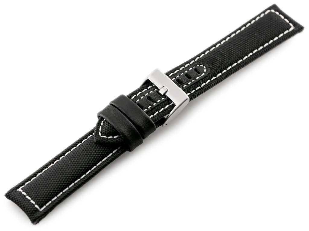 POPIS: Kožený vysoce kvalitní řemínek k hodinkám. Vnější část - plátno - v černé barvě s bílým prošíváním, vnitřní část - kůže - v černé barvě.