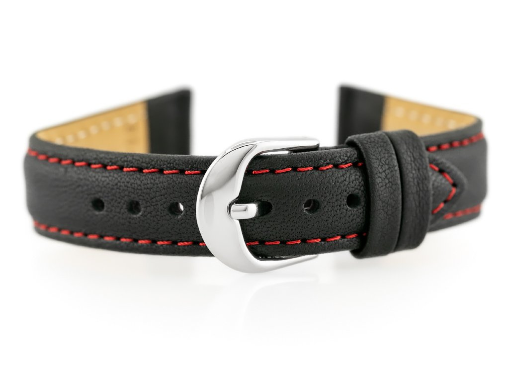 Přírodní černý kožený pásek s červeným prošíváním. Spona z nerezové oceli ve stříbrné barvě.