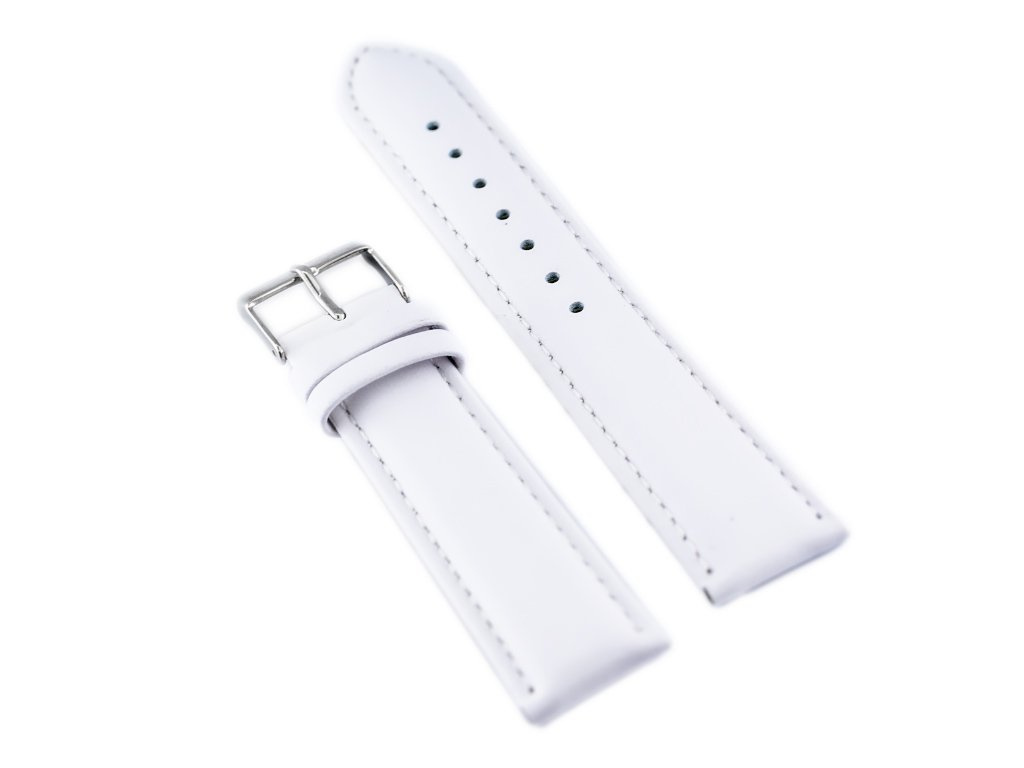 Bílý opasek z přírodní kůže s bílým prošíváním. Spona z nerezové oceli ve stříbrné barvě.