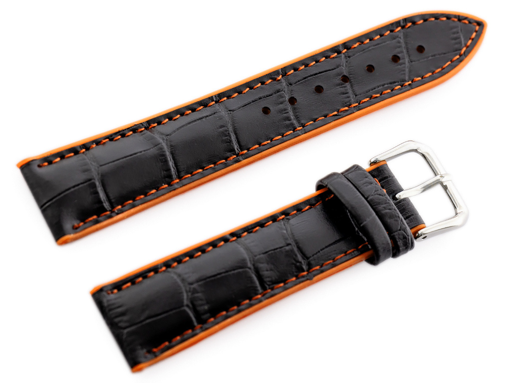 Oranžový a černý gumový pásek s koženým vrškem, prošívaný oranžovou nití.