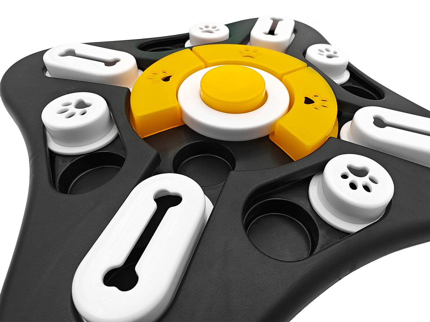 Pohyblivé části se otáčejí a centrální tlačítko vydává zvuk. Váš pes se tak učí logickému myšlení, rozvíjí své smysly a baví se objevováním dalších přihrádek s jídlem nebo pamlsky.