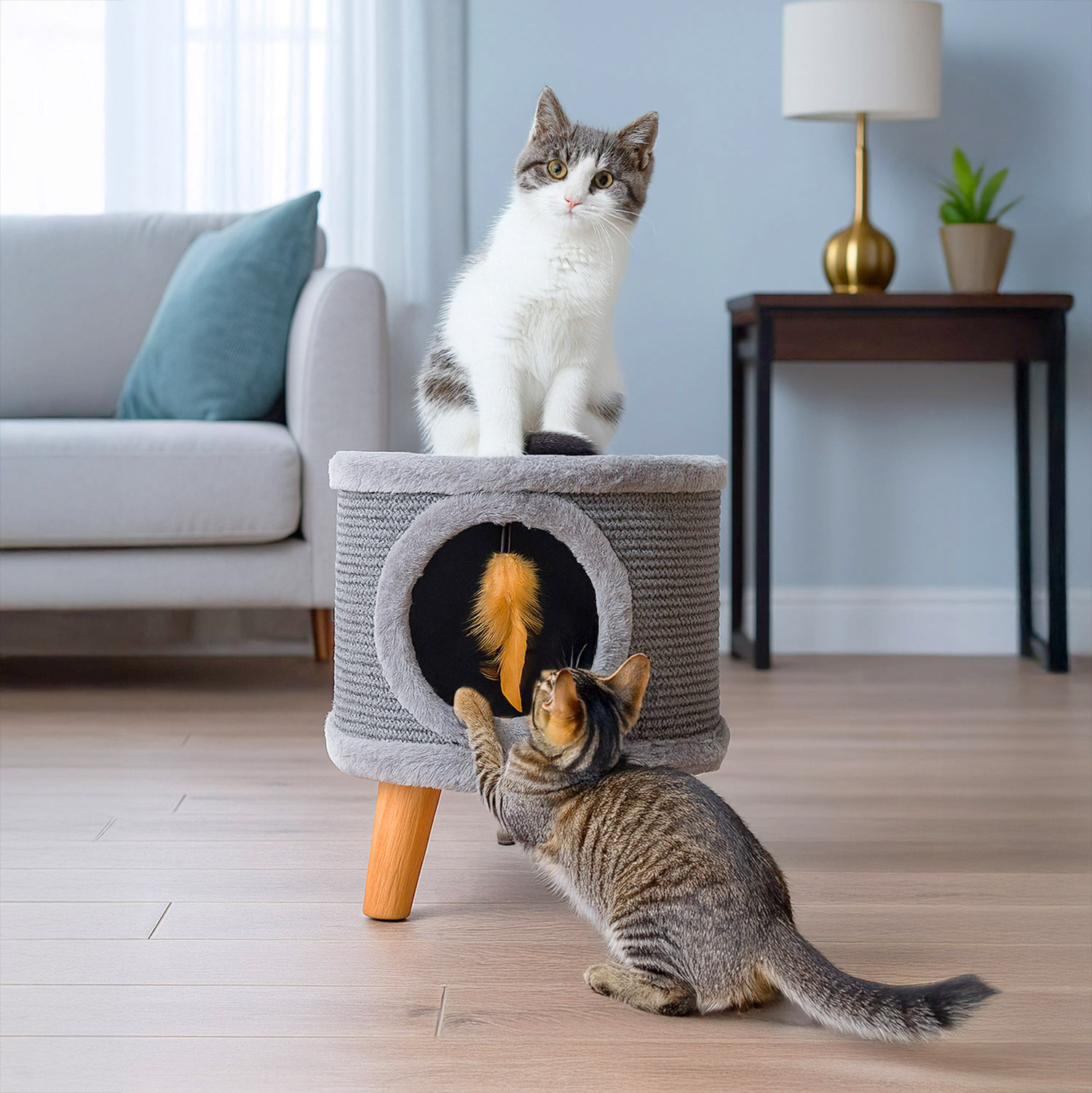 Robustní škrabadlo pro kočky, malé 38 cm, šedé s peřím a pelíškem Cabin II
