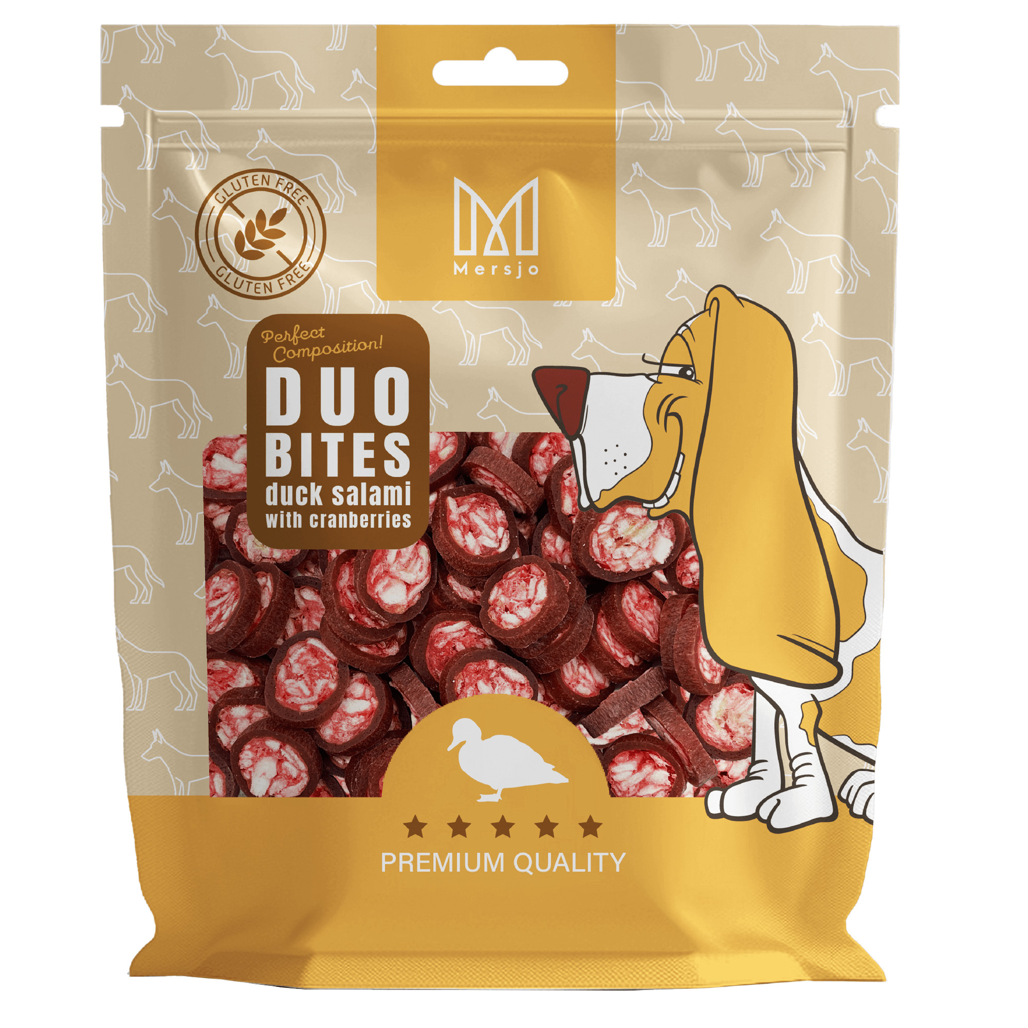 MERSJO je pamlsek z prémiového segmentu – bez obilovin. Náš aromatický salám je splněným snem každého psího labužníka. Podávejte je bez obav – jsou bezobilné a neobsahují umělá barviva ani konzervanty.